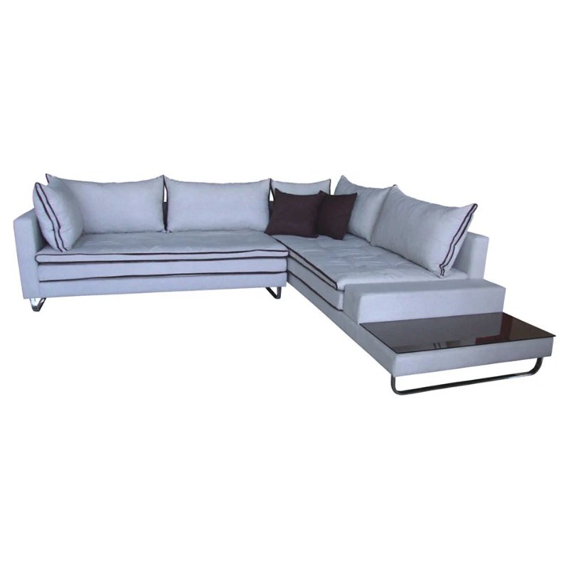 Γωνιακός καναπές με ενσωματωμένο βοηθητικό τραπεζάκι. Μαξιλάρι καθίσματος και ανώστρωμα για περισσότερη άνεση. Διακοσμητικές λεπτομέρεις με ρέλια.